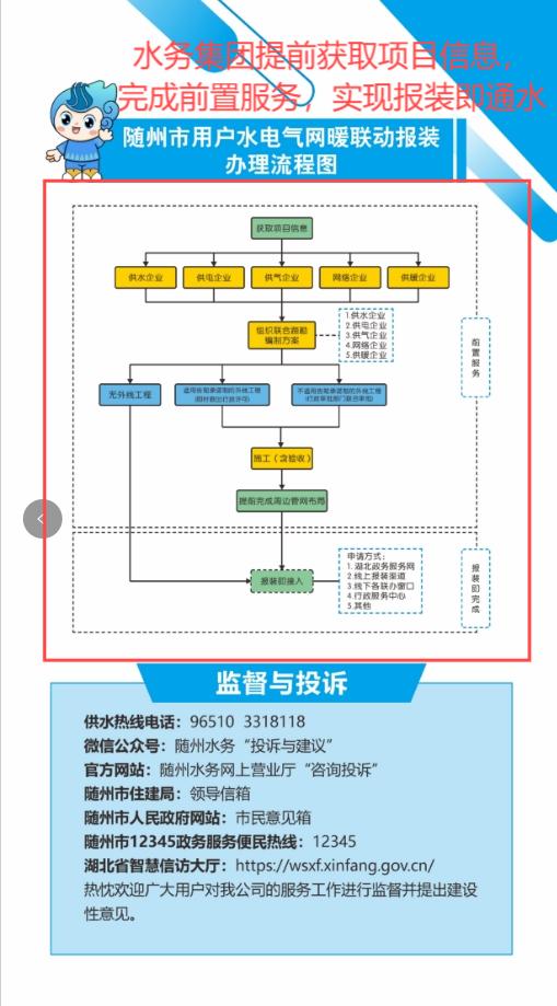 1.“零環(huán)節(jié)”:客戶需要用水時(shí),即時(shí)通水; 2.“零跑腿”:安排“客服專員”全程上門服務(wù),無需客戶跑腿; 3.“零資料”:通過湖北省工程建設(shè)審批系統(tǒng)、湖北省政務(wù)服務(wù)平臺(tái)獲取項(xiàng)目信息,無需客戶提報(bào)資料; 4.“零費(fèi)用”:針對(duì)企業(yè)用戶供水接入項(xiàng)目,工程設(shè)計(jì)、材料、監(jiān)理、施工全部免費(fèi)。 |