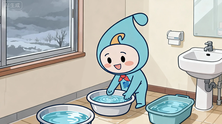 家中長期無人居住時,建議將室內或室外總閥關閉,打開最低處的水龍頭將水管內的積水排空,以免水管凍裂。建議用戶在低溫天氣期間適當儲水備用,避免因供水設施上凍造成生活不便。